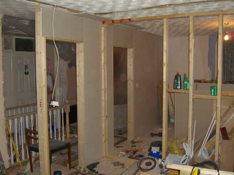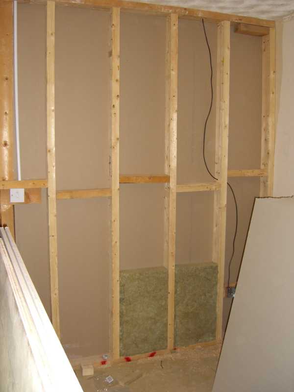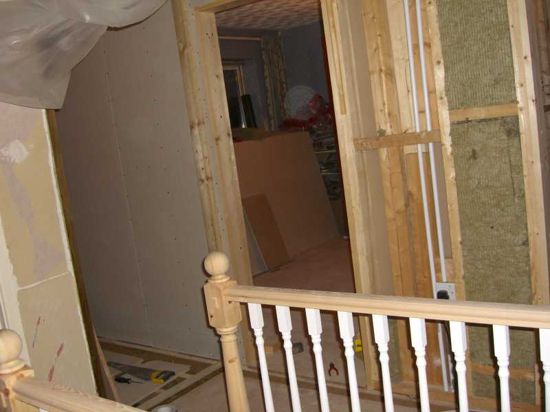| 18 November 2005Finally, an end to the shameless exhibitionism. No longer will it be quite so easy for people to see you on the loo for the plasterboard has started to go up. The green stuff in the gaps is Rockwool RW3 insulation. It's there for acoustic insulation rather than thermal. This is some of the more dense stuff at 60kg per cubic metre. Building regs say that new stud walls have to have insulation in for accoustic reasons; the minimum requirement is 10kg per cubic metre. The denser the better. This way I can make bubbles in the bath and nobody will hear ... or more to the point I can sing in the shower and get away with it.